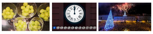 一年の最後、12月31日の夜を Nochevieja といいます。家族で夕食をともにすることが大晦日の伝統で、みんなでたくさん食べます!例えば、茹でエビやシーフード、ハム、チーズ、前菜、メインディッシュ、デザートなどです。そして、一年の最後の瞬間は、マドリードにあるソル広場の時計台の鐘の音に合わせて12粒のブドウを食べます。その後、カヴァで乾杯し、キスとハグで新年を祝います。あけましておめでとう!
